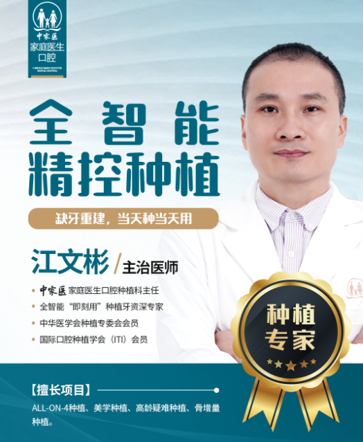 江文彬,中家医家庭医生种植科主任,资深全智能种植医师,至今从事口腔临床工作已近20年,曾长期在首级三甲医院从事口腔工作及临床教学指导,熟悉Ankylos、Nobel、Oeste等国际流种植品牌临床运用,掌握多种主流外科手术,至今已成功完成口腔种植病例数万例。