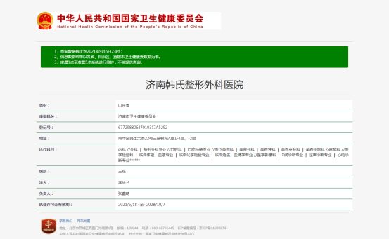 在长达二十年的时间里,韩氏整形外科医院始终不忘初心,坚持听党指挥、紧跟党的步伐,坚持标准化、透明化、专业化的行业标准,推动行业内部专业化系统发展,国家也给予其较高的肯定,在2019年12月25日经卫生部门综合评审、验收、批准,济南韩氏整形医院升级国家三级整形外科医院(山东首家),具有四级高难度整形手术资质)