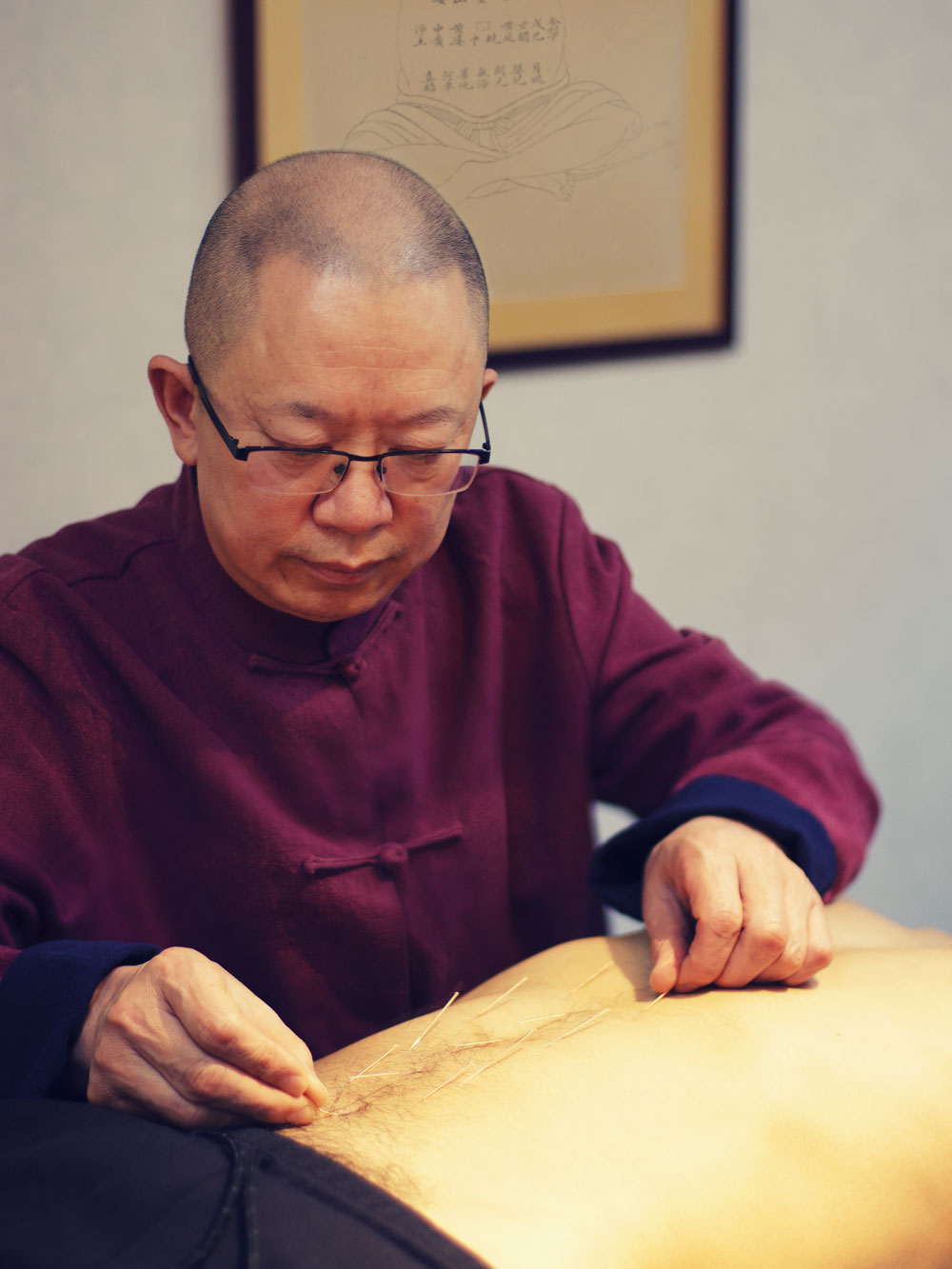 “医馆周边社区老年人多,压力性尿失禁发病率很高,但很多人并没有意识到这是一种疾病。”作为“张氏扶阳针灸”第三代传承人,庆德堂中医馆张天政主任这样说。他向我们展示了“张氏扶阳针灸”治疗压力性尿失禁的手法:使用125毫米长的针灸针,在腰骶部两穴位和尿道处施针,捻针手法复杂。针尾加艾绒,以文火燃尽,艾火温热经针体传导,可透达肌肤深部,谓之“温针”。