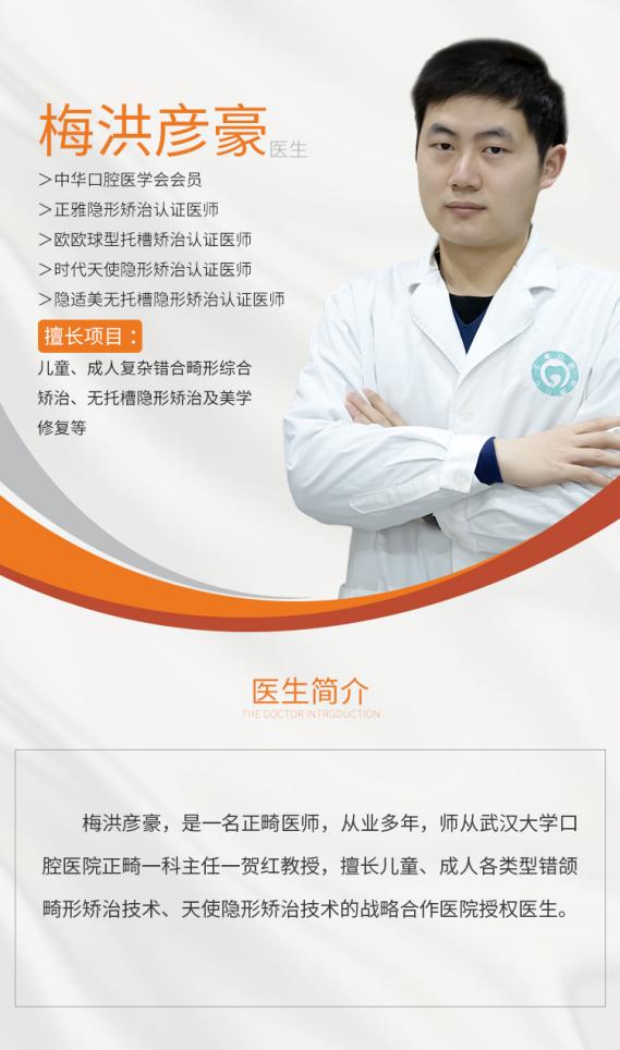 梅洪彦豪医生,中华口腔医学会会员,正雅隐形矫治认证医师,欧欧球型托槽矫治认证医师,时代天使隐形矫治认证医师,隐适美无托槽隐形矫治认证医师。