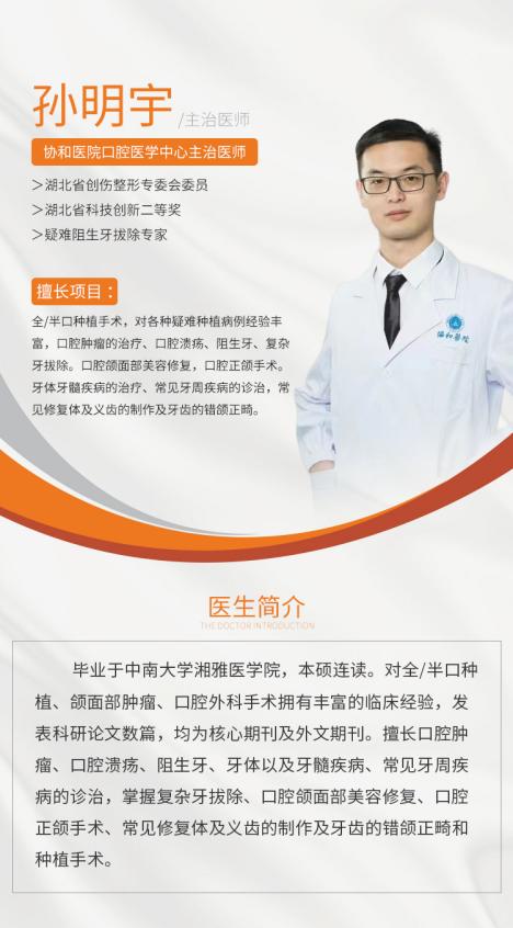 协和医院口腔医学中心主治医生-孙明宇专家,湖北省创伤整形专委会委员、湖北省科技创新二等奖、疑难阻生牙拔除专家、仁爱口腔医院特邀口腔种植专家。毕业于中南大学湘雅医学院,本硕连读。对全/半口种植、颌面部肿瘤、口腔外科手术拥有丰富的临床经验,发表科研论文数篇,均为核心期刊及外文期刊,对各种疑难种植病例经验丰富。