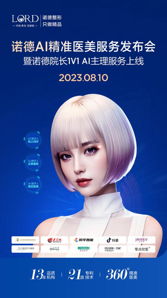 2023年8月10日,济南诺德医疗美容医院“数字医美节”逆龄美人启动会隆重举办。此次为山东首家AI智慧医美,汇聚美学大数据,360°精准医美,AI数字人在医美行业的应用比较宽泛,它可以实现AI数字人线上问诊、云享服务、高定智美,用大数据定制专属美学设计方案,致力于安全,个性之美。