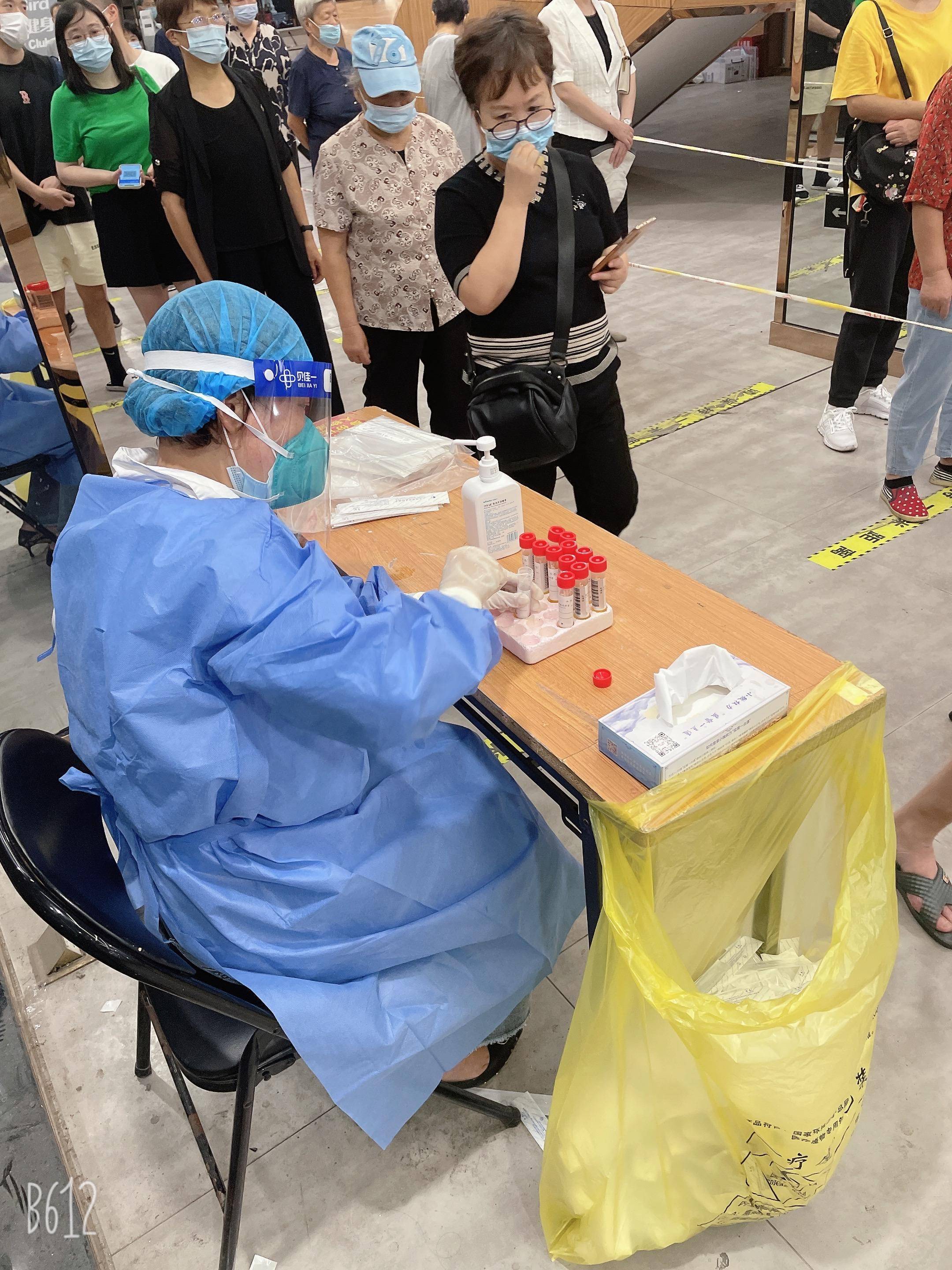 9月5日下午4点多,在南京秦淮区月牙湖街道苜蓿园社区的核酸采集点,有6位医护人员正在忙碌地为排队的居民进行核酸采样,她们是来自南京丁义山专科医院的爱心医疗队成员。